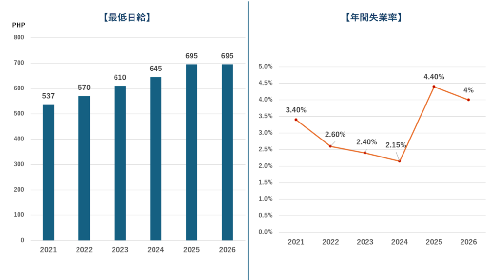 例として、2026年の予想最低賃金(日給)×20営業日=13,900PHP(約36,140円)となります。