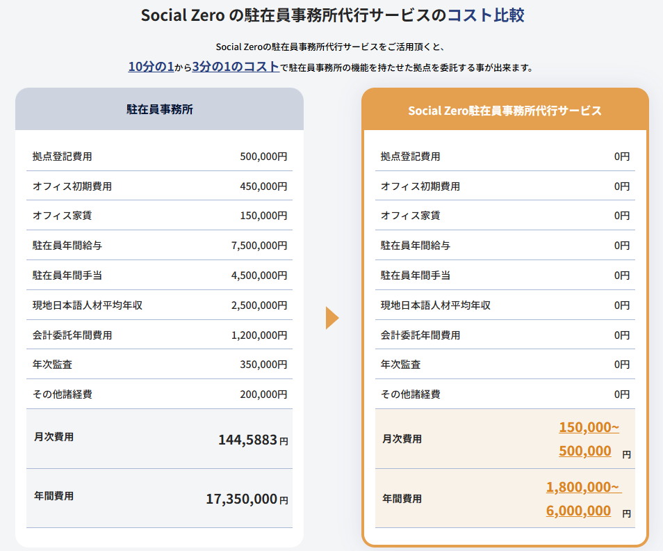 - 以下のコスト比較は、ASEAN諸国で最も安く駐在員事務所が開設・維持できる国の1つのベトナムで駐在員事務所を解説した場合と当社のサービスの比較となります。