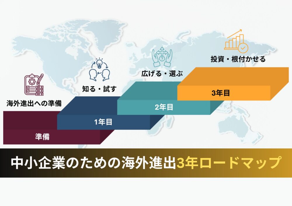 - 3年目:拠点設計(法人設立・人材・コスト構造)・3〜5年計画の策定